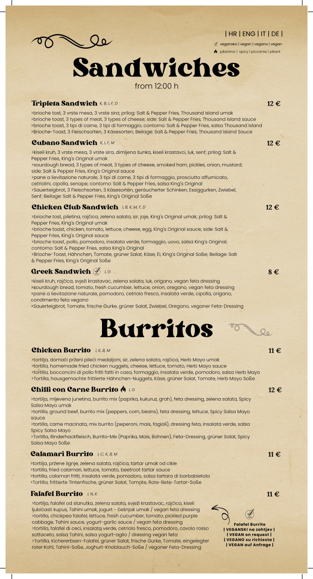 King’s Caffe Food Pub in Rijeka offers a remarkable blend of gastropub charm and top-notch dining. The menu stands out with its diverse range of tasty sandwiches, perfectly cooked fries, and inventive daily specials that redefine casual pub fare. Each dish carries a homemade authenticity, complemented by exceptional service that’s both friendly and accommodating. Highlights include their expertly crafted IPA beers and spot-on espresso, making it an ideal spot whether you're after a rich meal or a quality drink. Visitors praise the staff’s flexibility, from accommodating special requests to maintaining quick service during busy hours. The food strikes a balance between hearty and refined, delivering exceptional flavor at great value. Whether craving brunch favorites like French Toast or refreshing lemonade, King’s Caffe curates an inviting menu that captures the essence of a true food pub with a local twist. This is a place where quality meets comfort, leaving a lasting impression on both tourists and locals alike.